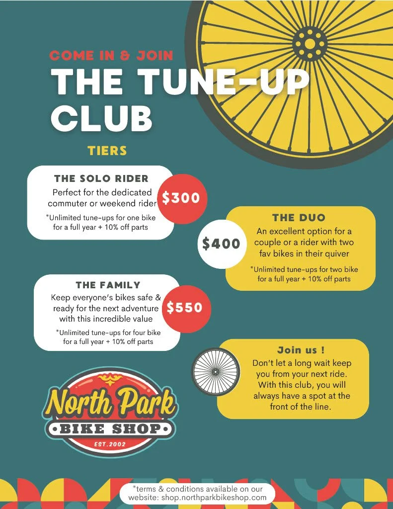 Looking to keep your bike in top shape all year long? Join the North Park Bike Shop Tune-Up Club and enjoy worry-free riding with unlimited tune-ups and exclusive discounts. Our club members receive priority servicing, ensuring your bike gets back on the road faster than ever.